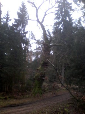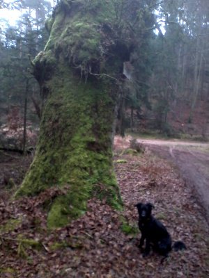 Dieser Novembertag lud ein zu einem herbstlichen Waldspaziergang. In Nebelschwaden getaucht leuchtete der Wald in braun-roten Farben. An einer Weggabelung stand unerwartet eine alte Eiche, wie man sie nur noch selten in unseren Wäldern findet. Ein wenig krumm gewachsen und verwunden, von der Wetterseite her bemost steht sie als stummer Zeitzeuge in den Wäldern um Erfweiler. Ein geschätzter Brustumfang von 6 Metern lässt auf ein hohes Alter schließen. Bleibt zu hoffen, dass es nicht wie ihrer Schwester, der „Dicken Eiche“ ergeht, und sie von einem Idioten angesägt wird. So ein alter Baum mit sicherlich über 300 – 400 Jahren ist einfach beeindruckend, aber leider gibt es nur viel zu wenige davon.
