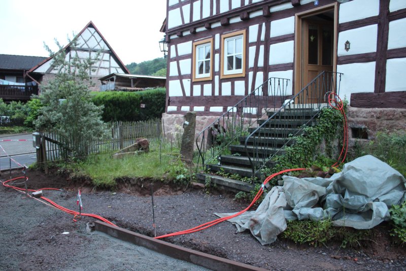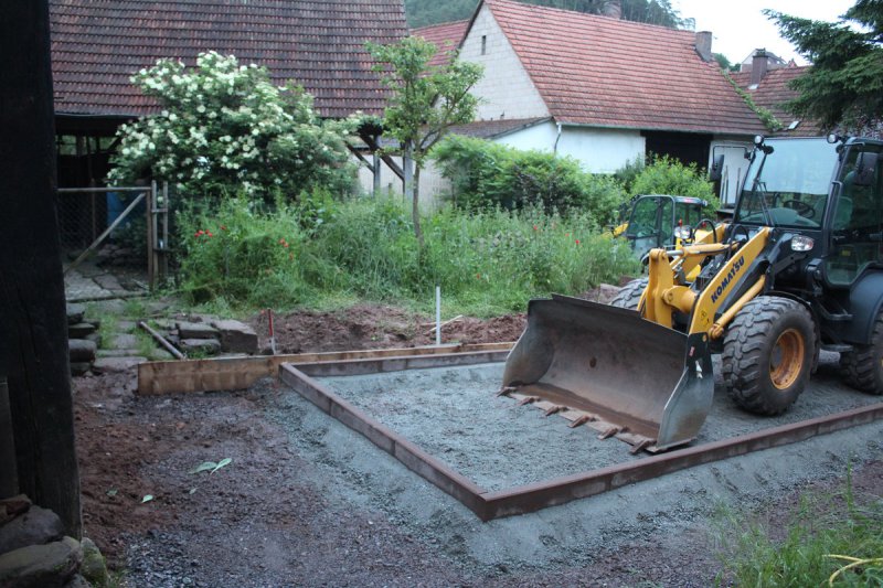 Allmählich lassen sich die Wegeführung und die Gefälleausbildung erahnen. Die Bordsteine sind in der Tragschicht gesetzt so das die Filter- und Deckschicht eingebaut und verdichtet werden können.