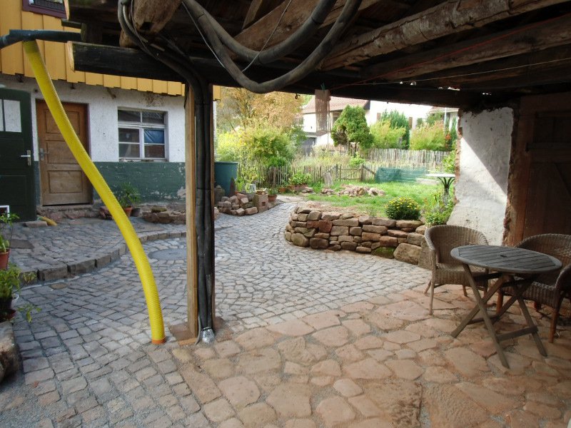 Der Tank für die Zisterne ist vergraben und unsere Terrasse präsentiert sich mit Kopfsteinpflaster bzw. Bruchstücken aus dem altem Sandsteinbelag. Wir freuen uns schon auf den nächsten Sommer mit gemütlicher Sitzecke.